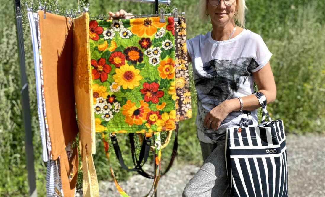 Pärnu Uuskasutuskeskuses töötav Kersti Jüri meisterdab vabal ajal tekstiilijääkidest praktilisi kotte.