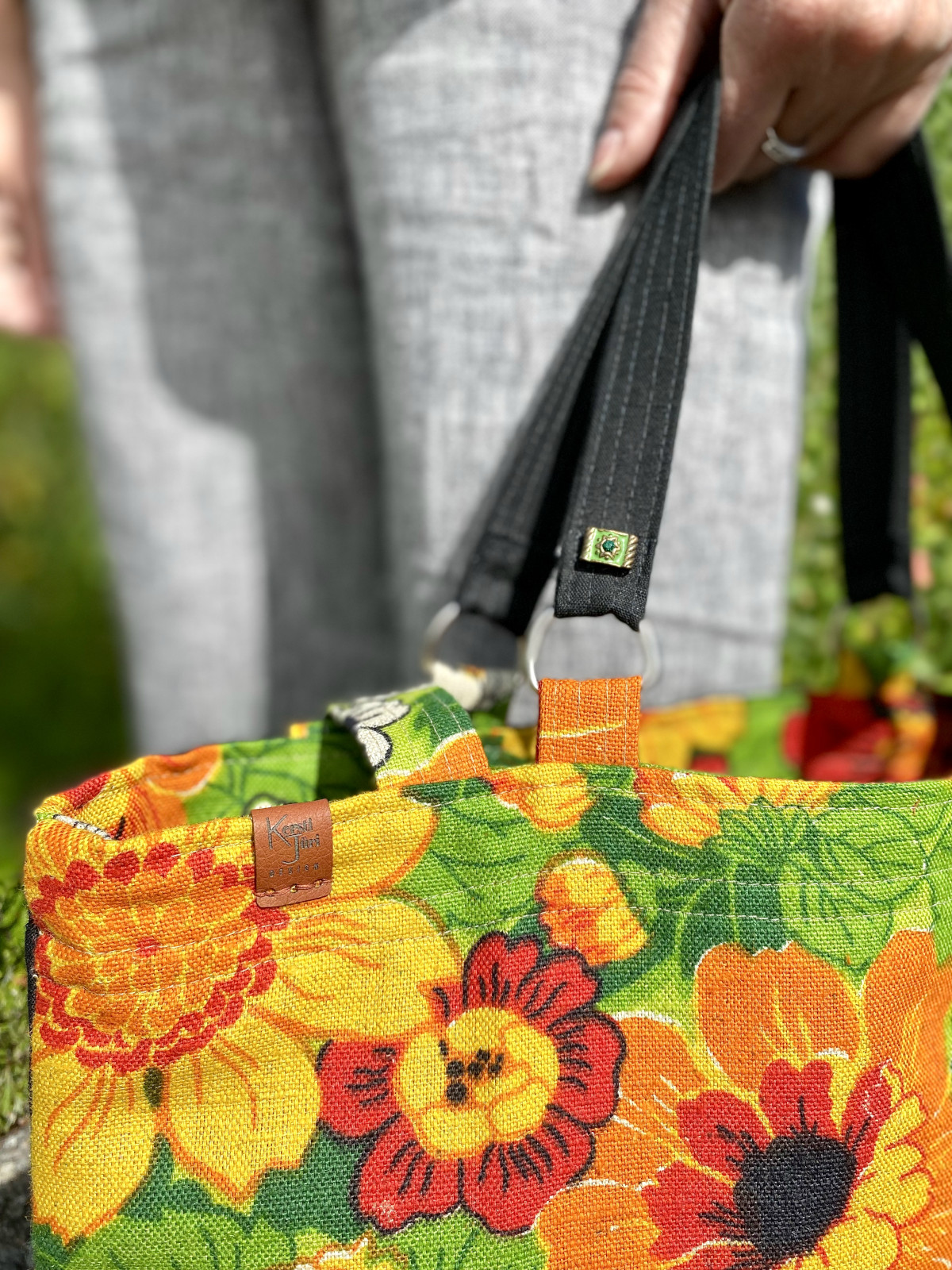 Viimase sammuna triigin, lisan detailid ja omanimelise kunstnahast logo. Iludetailidena olen veel kasutanud erinevaid helmeid ja ka katkiseid ehteid. Näiteks vööst võib saada kotile sang ja pandlast kaunistus. Olen kasutanud mitmesuguseid nõukaaegseid retrokanga jääke ja paelu, võimalused on lõputud!