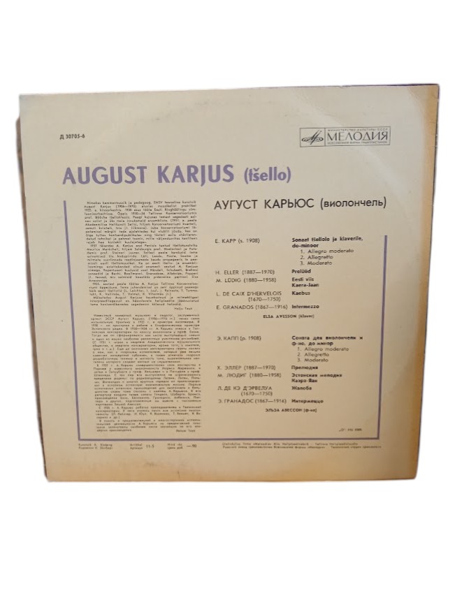Tšellist August Karjuse ja tema kauaaegse lavapartneri pianist Elsa Avessoni heliplaadil kõlavad Eugen Kapi, Mihkel Lüdigi, Heino Elleri ja Alfred Karindi kammerteosed. Haruldane kümnetolline vinüülplaat on ilmunud veel enne üleliidulise heliplaadifirma Melodija loomist 1959. aastal Riia plaadifirma Ligo nime alt. Albumi kõige ulatuslikum teos on pikka aega August Karjuse ja Elsa Avessoni duo repertuaari kuulunud ning ühtlasi Karjuse tellimusel valminud Eugen Kapi “Sonaat tšellole ja klaverile. Plaadil kõlavad ka Mihkel Lüdigi “Ballaad”, Heino Elleri “Prelüüd” ja Alfred Karindi “Meditatsioon”.