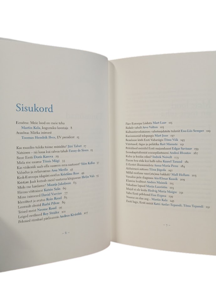 Käesolev esseekogumik on valminud kümnete Eesti mõtlejate ühistööna. Autorite seas on tuntud teadusinimesi, akadeemikuid ja professoreid, poliitikuid, majandustegelasi, ajakirjanikke, kunstnikke, teatri- ja filmitegijaid ning popkultuuri tähti.