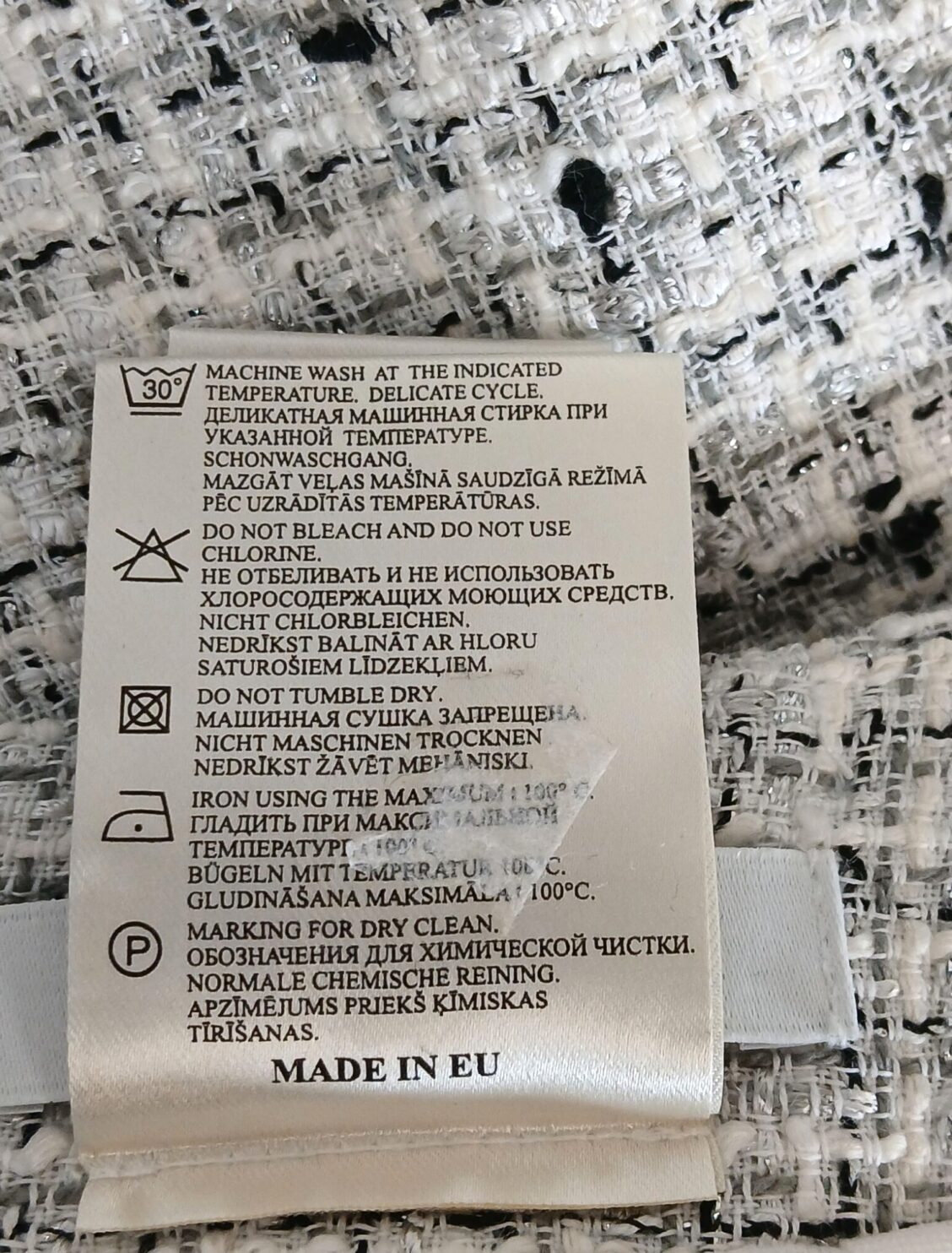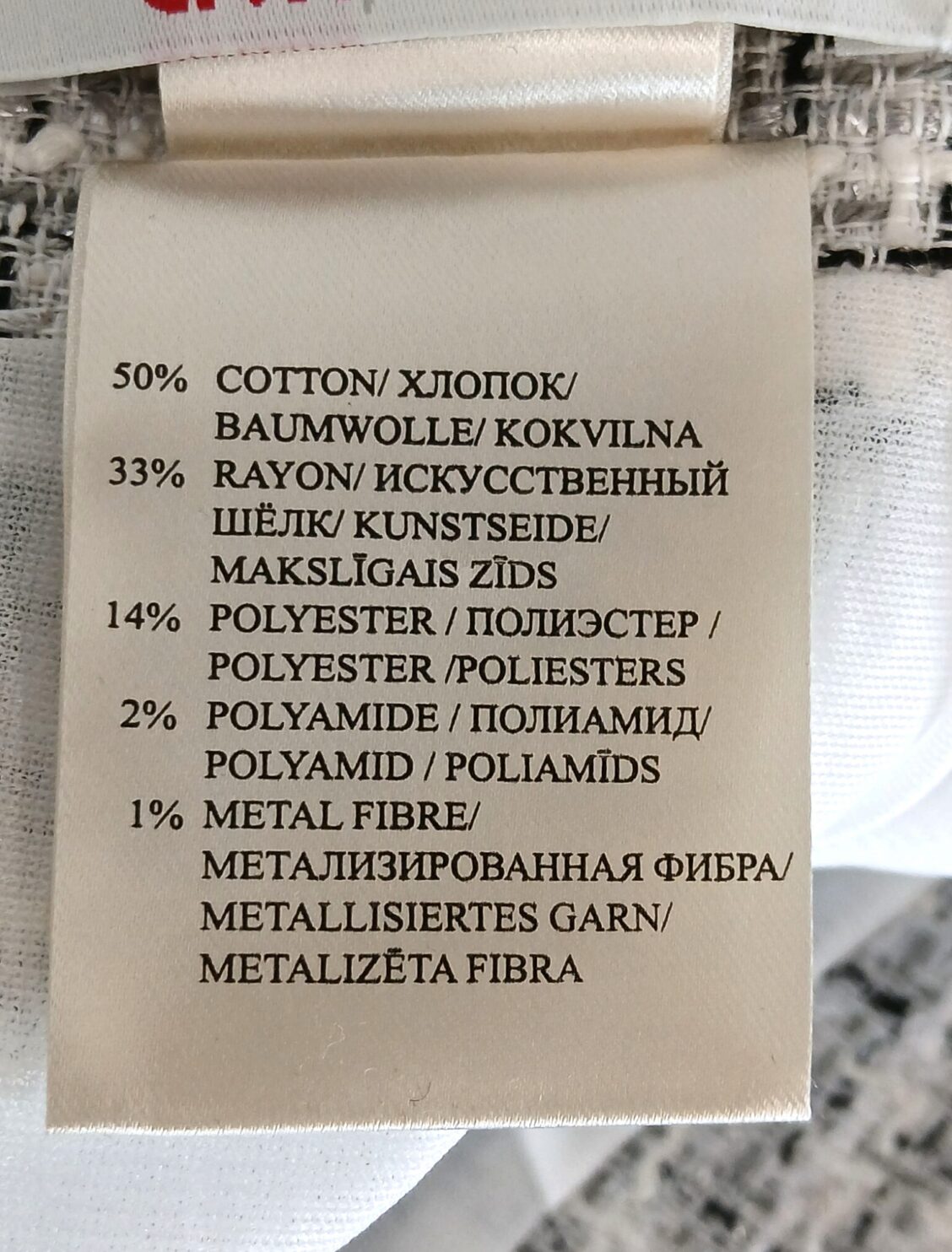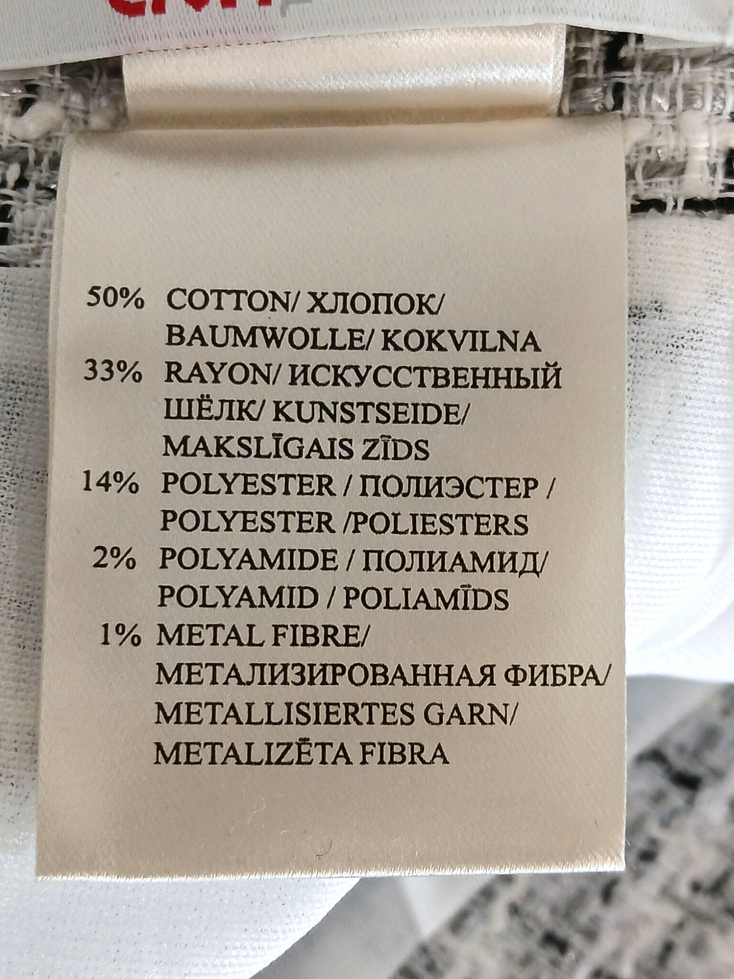 Materjal: 50% puuvill, 33% kunstsiid, 14% polüester, 2% polüamiid, 1% metallkiud