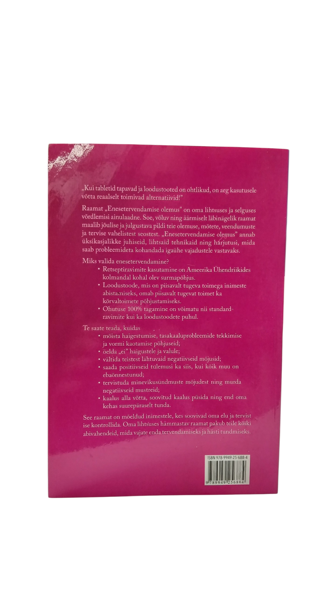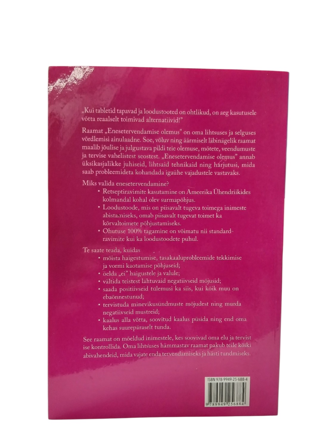 Kuidas tuua oma ellu tervist ja õnne „Kui tabletid tapavad ja loodustooted on ohtlikud, on aeg kasutusele võtta reaalselt toimivad alternatiivid!” Raamat „Enesetervendamise olemus” on oma lihtsuses ja selguses võrdlemisi ainulaadne. Soe, võluv ning äärmiselt läbinägelik raamat maalib jõulise ja julgustava pildi teie olemuse, mõtete, veendumuste ja tervise vahelistest seostest. „Enesetervendamise olemus” annab üksikasjalikke juhiseid, lihtsaid tehnikaid ning harjutusi, mida saab probleemideta kohandada igaühe vajadustele vastavaks. Miks valida enesetervendamine? • Retseptiravimite kasutamine on Ameerika Ühendriikides kolmandal kohal olev surmapõhjus. • Loodustoode, mis on piisavalt tugeva toimega inimeste abistamiseks, omab piisavalt tugevat toimet ka kõrvaltoimete põhjustamiseks. • Ohutuse 100% tagamine on võimatu nii standardravimite kui ka loodustoodete puhul. Te saate teada, kuidas • mõista haigestumise, tasakaaluprobleemide tekkimise ja vormi kaotamise põhjuseid; • öelda „ei” haigustele ja valule; • vältida teistest lähtuvaid negatiivseid mõjusid; • saada positiivseid tulemusi ka siis, kui kõik muu on ebaõnnestunud; • tervistuda minevikusündmuste mõjudest ning murda negatiivseid mustreid; • kaalus alla võtta, soovitud kaalus püsida ning end oma kehas suurepäraselt tunda. See raamat on mõeldud inimestele, kes soovivad oma elu ja tervist ise kontrollida. Oma lihtsuses hämmastav raamat pakub teile kõiki abivahendeid, mida vajate enda tervendamiseks ja hästi tundmiseks.