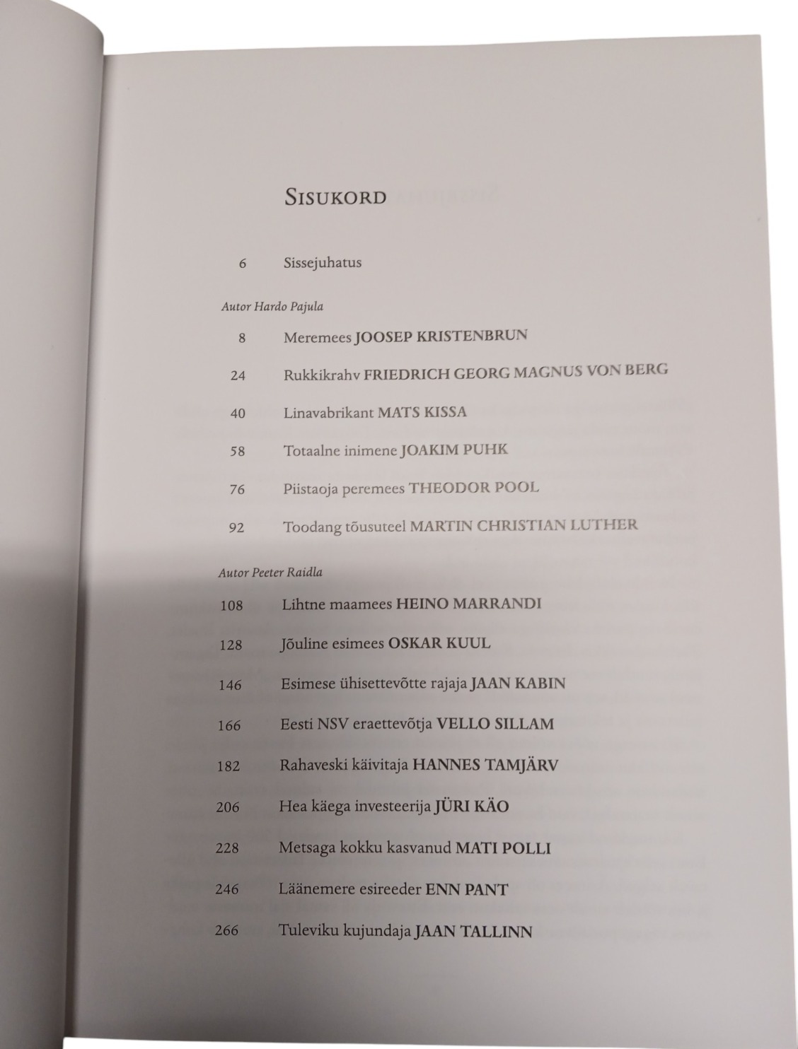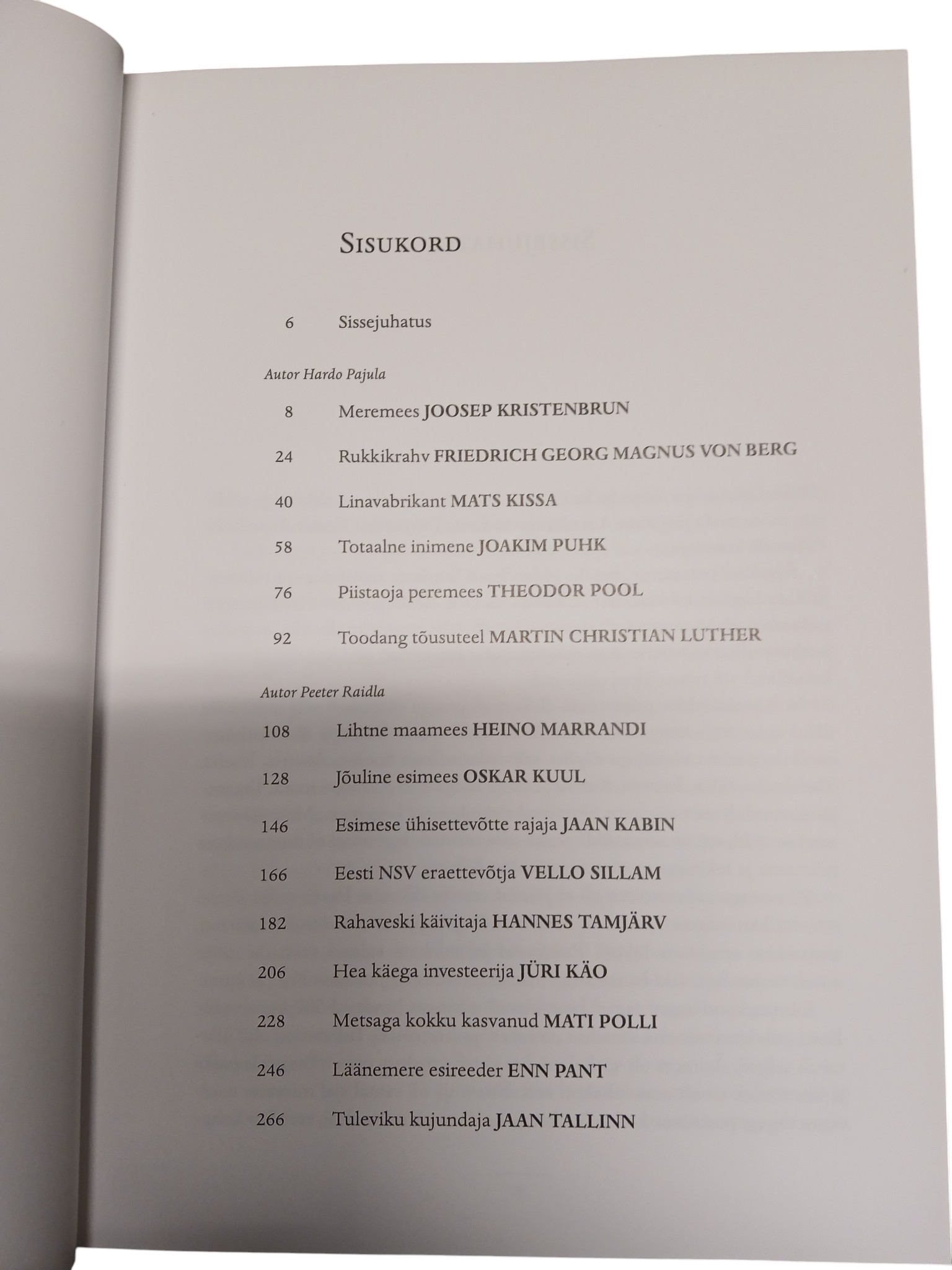 Raamat kirjeldab 15 Eesti juhtiva majandus- ja tööstusjuhi lugusid rohkem kui 100 aasta jooksul. Kõiki portreteeritud inimesi iseloomustab kirglik soov arendada oma valdkonda ja eesmärke ellu viia, nad olid nupukad ja suure töövõimega. Samas olid nad veelgi enamat – nad oli kohalikud, maakondlikud või rahvuslikud eluliidrid. Raamatu juhatab sisse Käsmu purjelevanduse isa Joosep Kristenbrun. Esimesest Vene ajast on portreteeritvate seas veel baltisaksa põllumees Georg Magnus von Berg ning linatööstur Mats Kissa. Esimesest omariiklusajast põlistavad Eesti ettevõtlust Joakim Puhk, Euroopa kõige radikaalsema maareformi põhiarhitekt Theodor Pool ja praeguse tööandjate keskliidu eelkäija Eesti vabrikantide ühisuse asutaja ja Eesti Panga nõukogu liige Martin Cristian Luther. ENSV ja Eesti vabariigi ajast väärivad meenutamist põllumees Heino Marrandi, kalurikolhoosi esimees Oskar Kuul, esimese ühisettevõtte rajaja Jaan Kabin, eraettevõtja Vello Sillam, panga asutaja Hannes Tamjärv, suurettevõtja Jüri Käo, metsamees Mati Polli, esireeder Enn Pant ja tulevikku vaatav Jaan Tallinn.