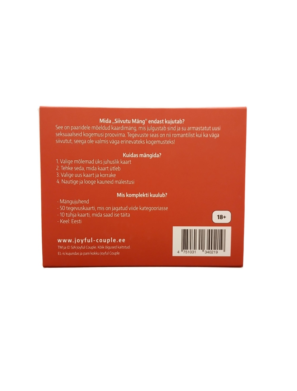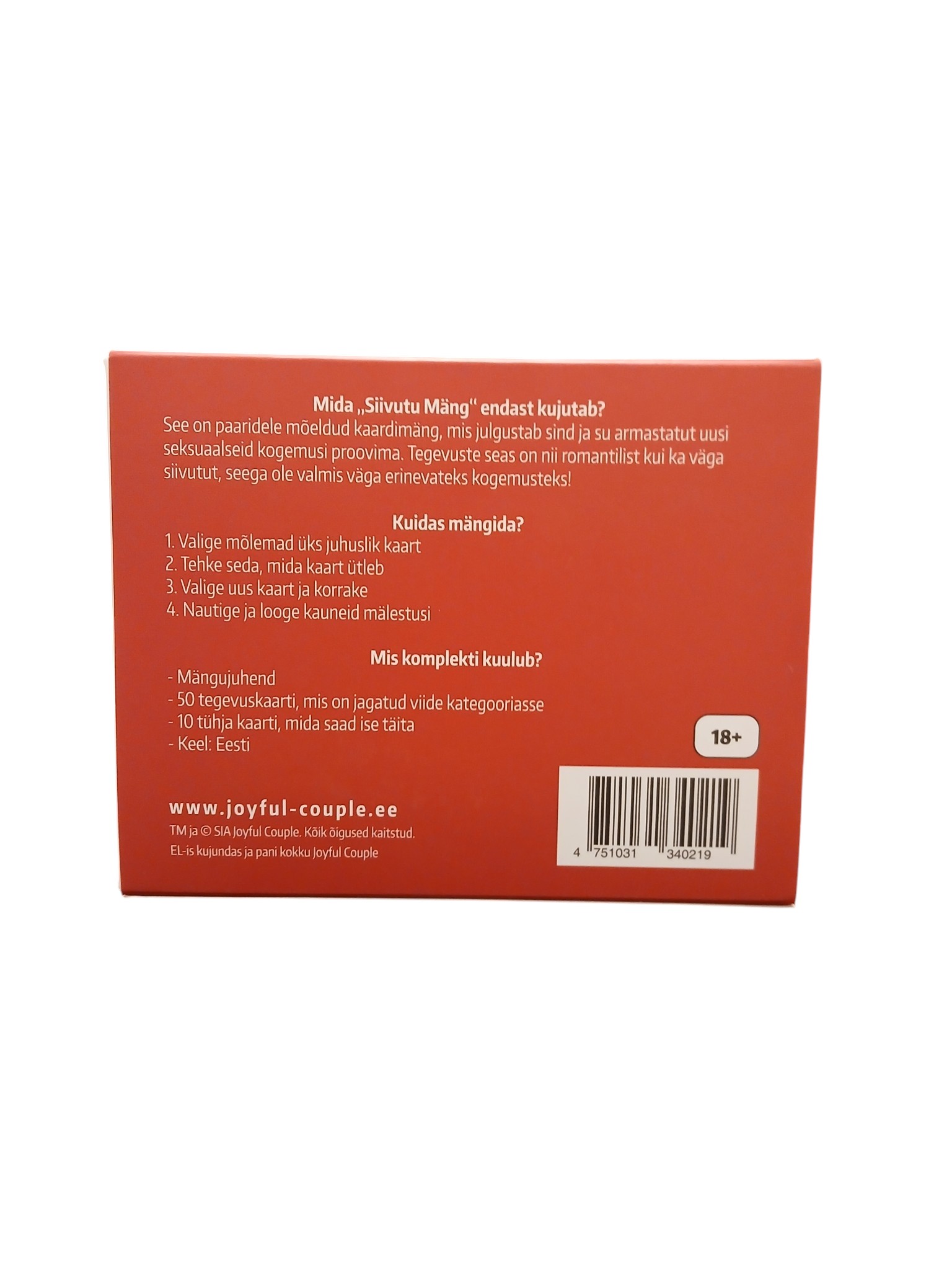 “Siivutu Mäng“ on täiskasvanud paaridele mõeldud ulakas kaardimäng, mis julgustab sind ja su armastatut uusi seksuaalseid kogemusi proovima. See mäng sobib ideaalselt neile, kes soovivad kogeda erinevaid aistinguid ‒ mõnusast romantikast kirglike naudinguteni. Mäng sisaldab 50 tegevust, mis on jagatud viide rühma, igas kümme kaarti. Soojenduskaardid on romantiliseks soojenduseks ning nende järel võib ette võtta õrritavad seksikad ja kuumad kaardid. Seejärel saad oma ihad valla lasta ning liikuda erootiliste ja metsikute kaartide juurde, mis viivad sind seksuaalselt uutesse kõrgustesse. Kaardid on sensuaalset punast värvi ja valmistatud kvaliteetsest mati kattega paberist. Mäng on pakendatud stiilsesse punase lipsuga karpi, mistõttu on see täiuslik kingitus noorpaaridele, poissmeestele ja vallalistele neidudele, nii aastapäevadeks kui ka sünnipäevadeks! Komplekti kuuluvad: – Kinkevalmis stiilne pakend; – Mängujuhend; – 50 kvaliteetset mängukaarti, mis sisaldavad nii romantilisi kui ka päris ulakaid tegevusi. – kümme tühja kaarti, kus saad oma loovusel lennata lasta. Vanusepiirang: 18+