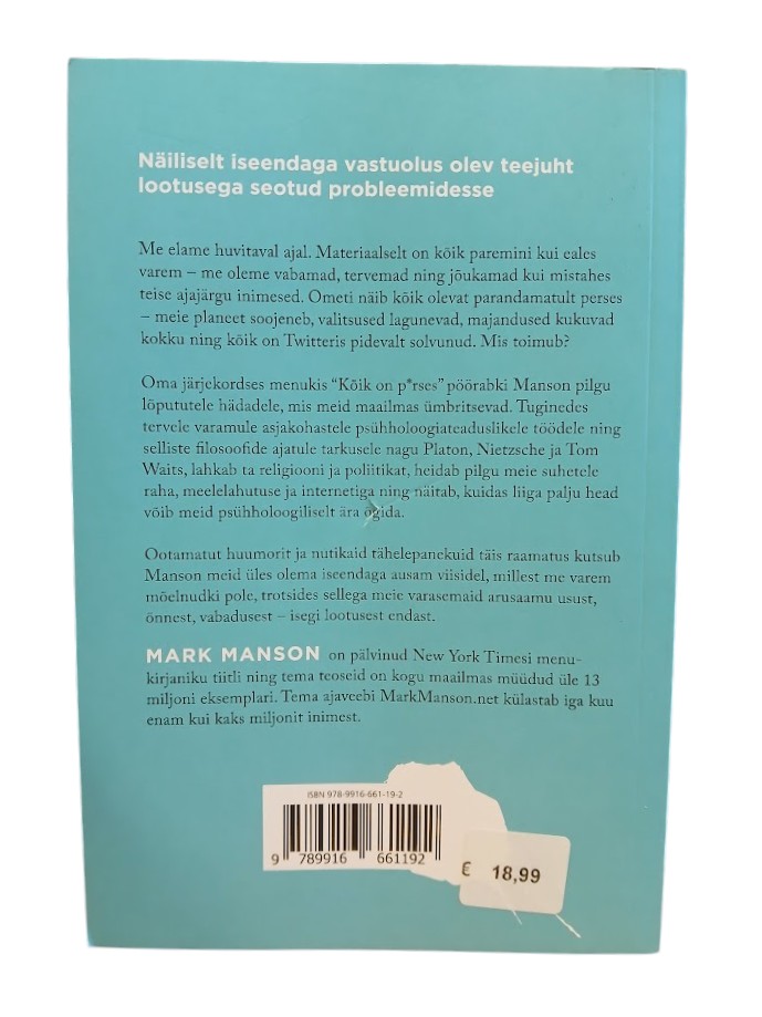 Ootamatut huumorit ja nutikaid tähelepanekuid täis raamatus kutsub Manson meid üles olema iseendaga ausam viisidel, millest me varem mõelnudki pole, trotsides sellega meie varasemaid arusaamu usust, õnnest, vabadusest – isegi lootusest endast.
