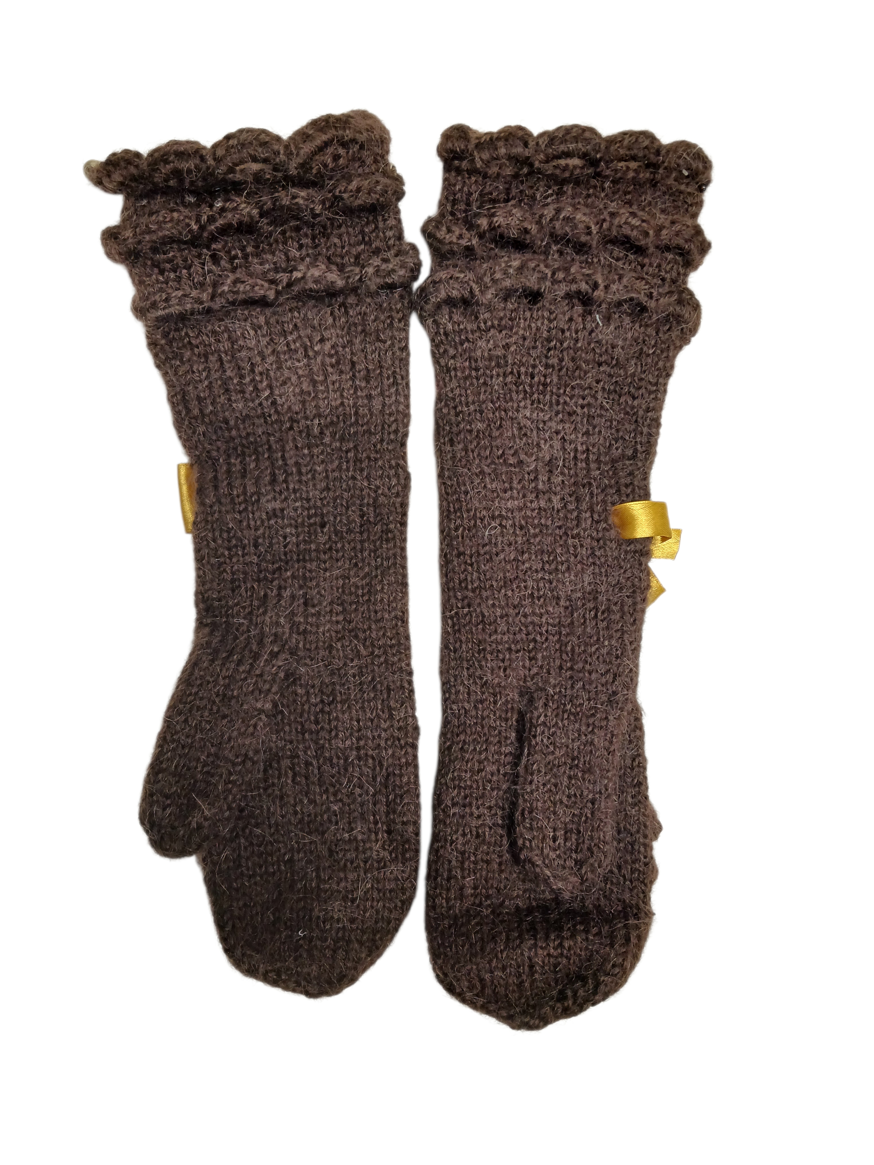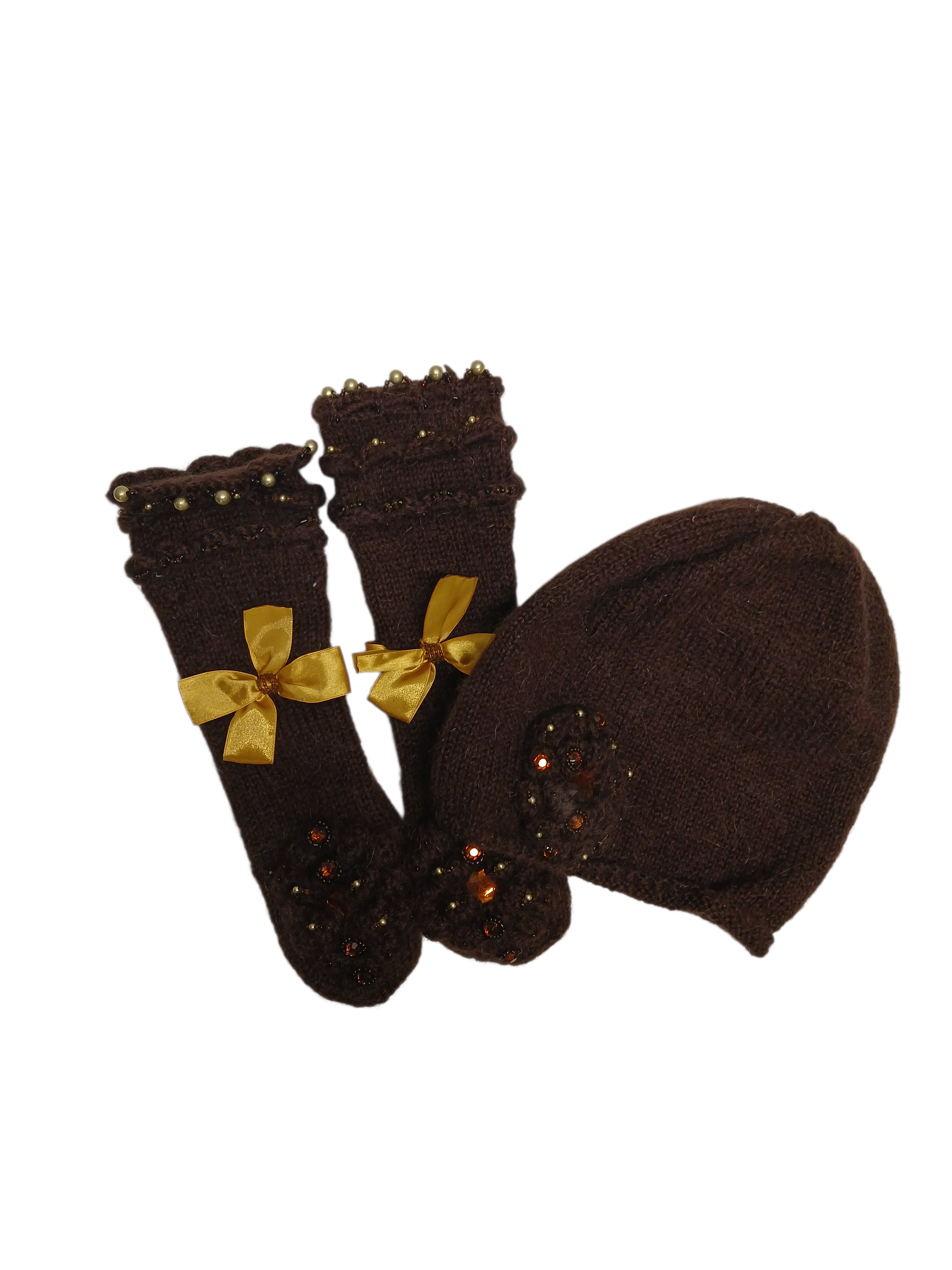 Lisamärkused: mütsi alumine äär on 23 cm lai, väga ei veni (ei ole soonik). Kootud tihedas koes, ilma voodrita. Kindad sobivad kitsamale käele S/M. Tumepruunid.