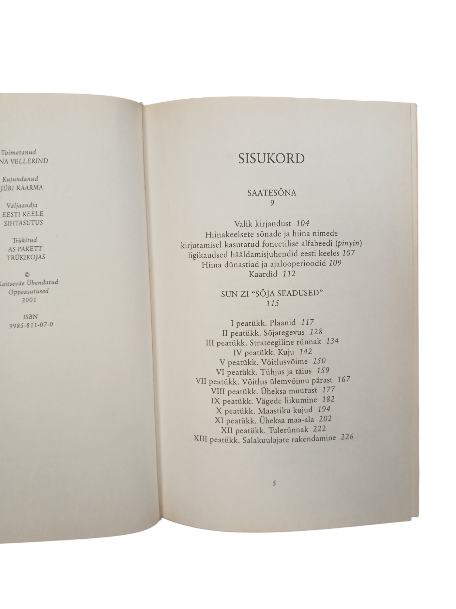 Vana-Hiina legendaarse väejuhi ja sõjafilosoofi Sun Zi (6.-5. saj e.m.a) ning tema järeltulija, jalutu strateegi Sun Bini (4. saj e.m.a) näpunäited ja elutarkused, kuidas toimida sõjaolukorras ehk üldse igasuguses kriisi ja vastasseisu puhul, neid arukalt ja võimalikult väheste kaotustega lahendada, on igikestvad ja rakendatavad tänapäeval samavõrd kui Vana-Hiinas. Muistsete sõjatarkade õpetuse kvintessentsi võib kokku võtta kolme lausega. Parim sõda on sõda, mis jääbki pidamata. Parim taktika on taktika, millega vaenlane kaasa läheb, pidades seda enda omaks. Iga vastasseisu parim lahendus on selline, kust mõlemad pooled väljuvad rahuloleva ja võitjana. Sun Zi esimene eestikeelne väljaanne on tõlkija poolt rikkalikult kommenteeritud. Mahukas saatesõna ja lisad teevad sellest Vana-Hiina ajaloo väikese käsiraamatu.