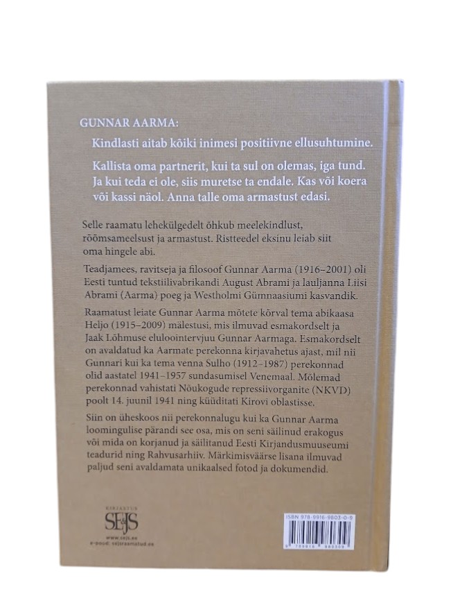 Selle raamatu lehekülgedelt õhkub meelekindlust, rõõmsameelsust ja armastust. Ristteedel eksinu leiab siit oma hingele abi. Teadjamees, ravitseja ja filosoof Gunnar Aarma (1916–2001) oli Eesti tuntud tekstiilivabrikandi August Abrami ja lauljanna Liisi Abrami (Aarma) poeg ja Westholmi Gümnaasiumi kasvandik. Koguteosest leiab lugeja Gunnar Aarma loomingulise pärandi selle osa, mis on seni olnud varjul vaid erakogus või mida on korjanud ja säilitanud Eesti Kirjandusmuuseumi teadurid ning Rahvusarhiiv. Aarma mõttevaramu kõrval leiab lugeja sellest raamatust ka Gunnari abikaasa Heljo (1915–2009) mälestused, mis ilmuvad esmakordselt, nagu ka Jaak Lõhmuse pikk eluloointervjuu Gunnar Aarmaga.