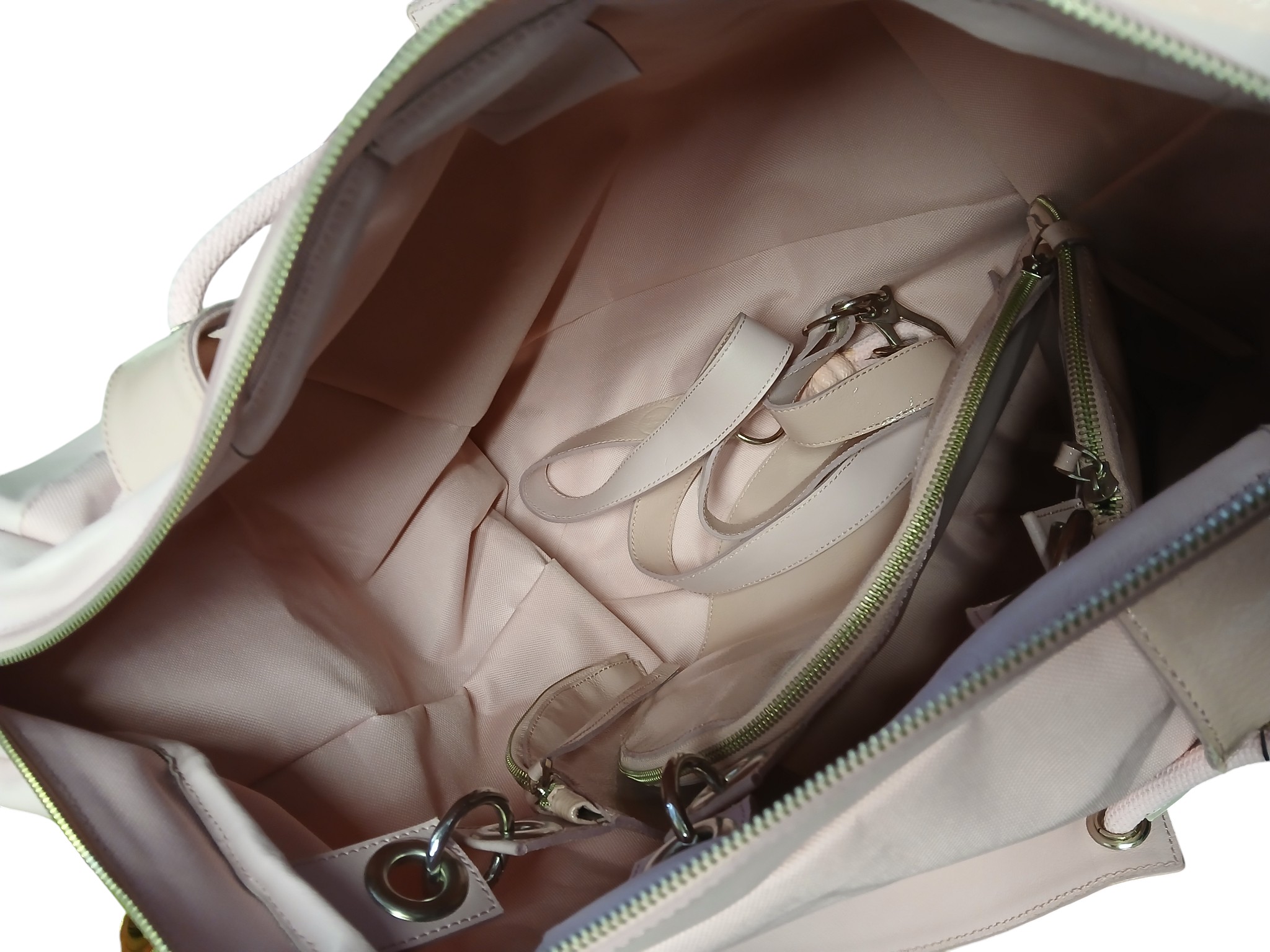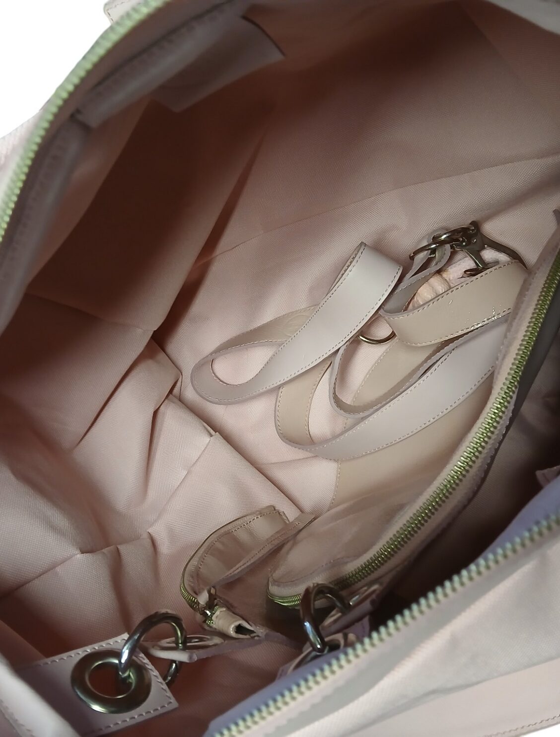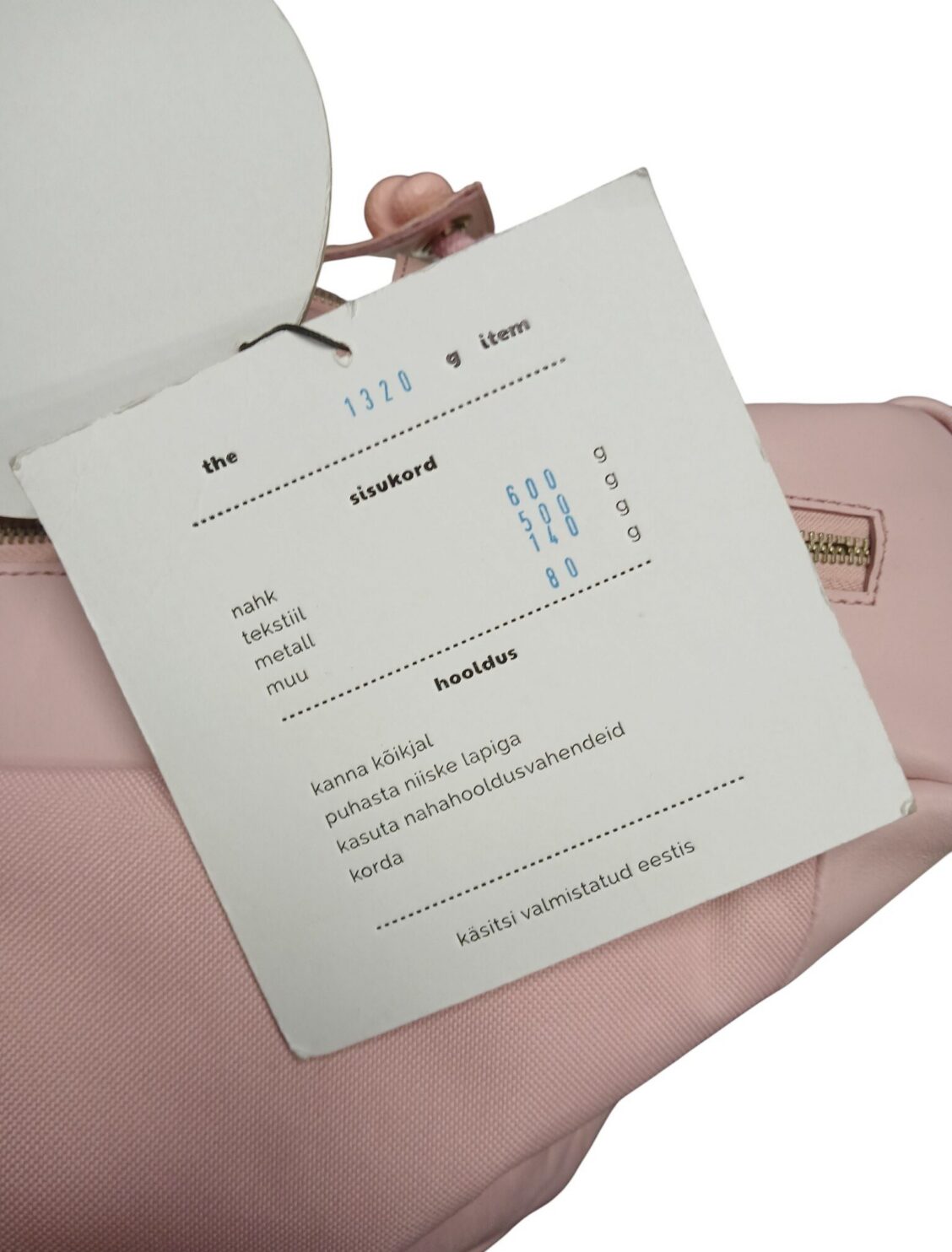Lisamärkused: Väliselt kohati natuke määrdunud. Heleroosat värvi. Sees mitu erinevat väiksemat kotti, mis kinnitatud koti sisu sisse, võimalik eemaldada. Seest korralik. Kaasas pikem rihm. Handmade in Estonia.