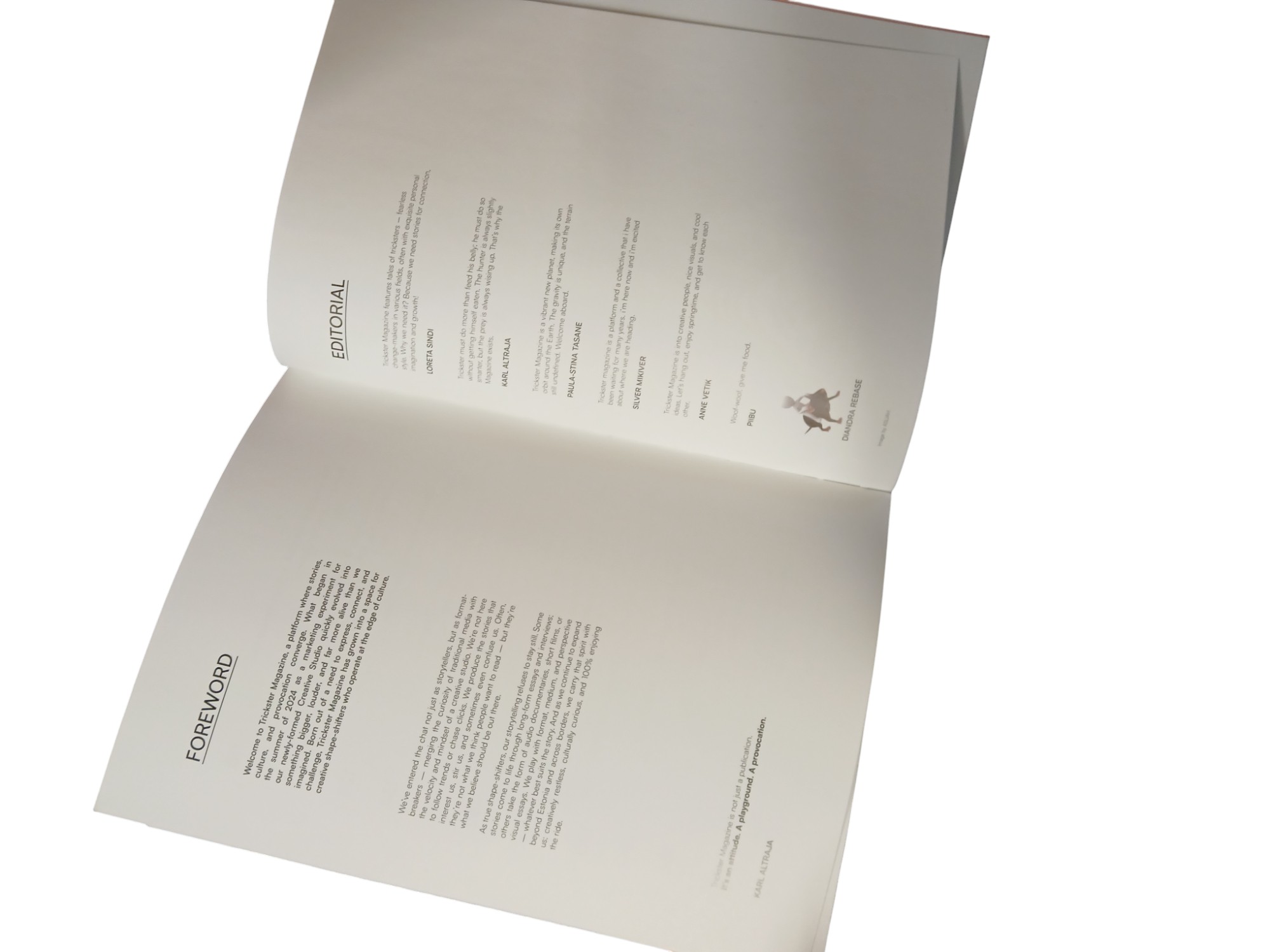 Trickter Magazine sai alguse 2024. aasta suvel loomingulise stuudio eksperimendina, mis on nüüdseks kasvanud loomeinimeste eneseväljendusplatvormiks, keskendudes isiklikele lugudele, innovaatilistele moefotodele ja laiapõhjalisele kultuurikoolitusele. Trickter Magazine ühendab traditsioonilise meedia ja loomingulise stuudio energia. Nad liiguvad formaatide vahel, alates esseedest ja intervjuudest kuni pildikesksete narratiivide ja eksperimentaalsete vormideni. (google tõlge)