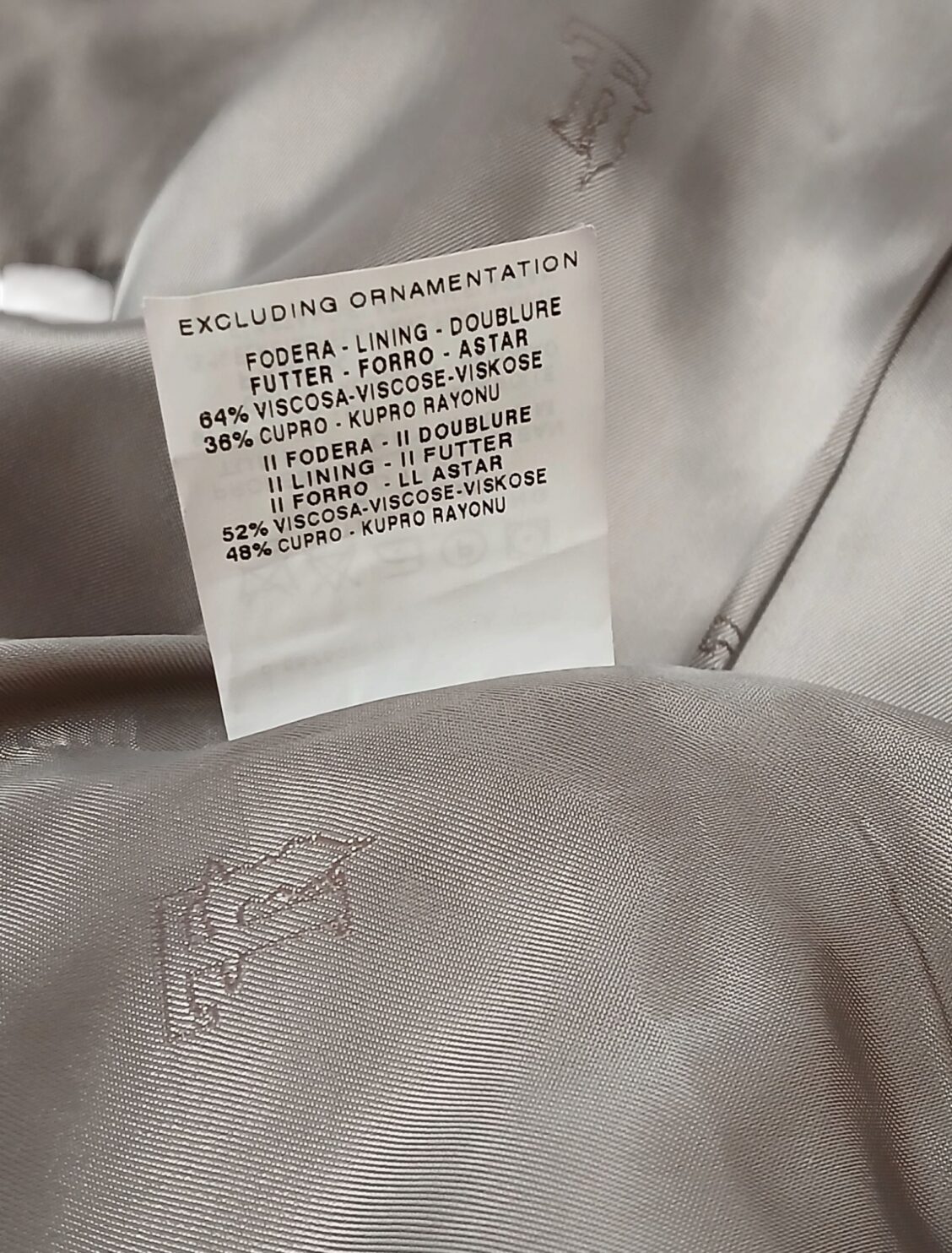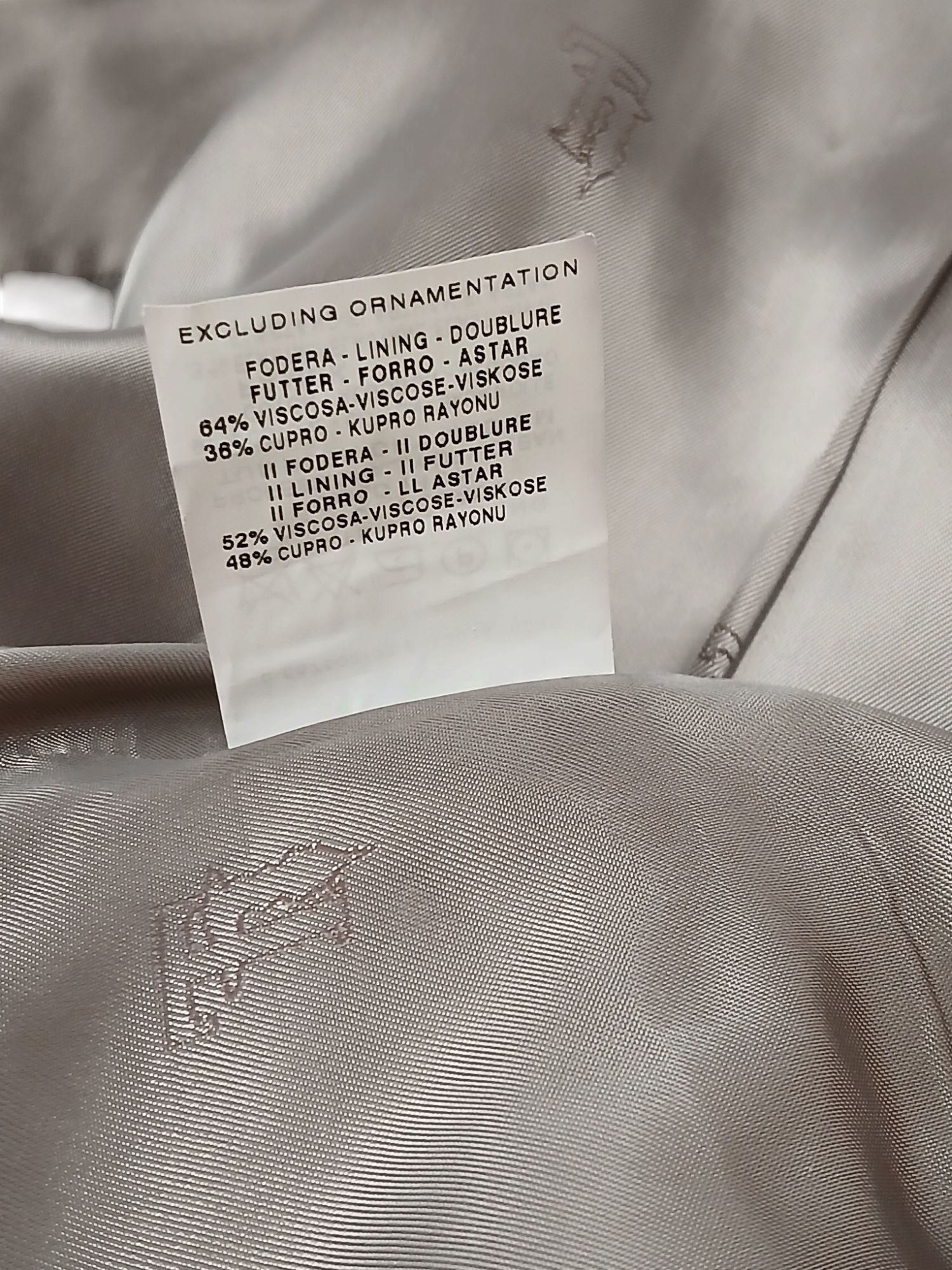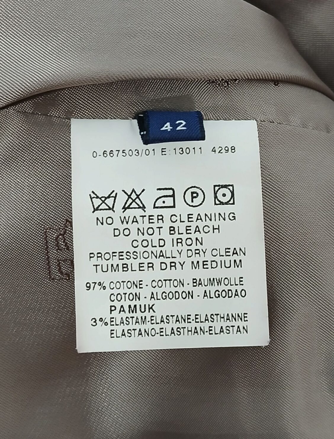 Materjal: 97% puuvill, 3% elastaan; vooder: 64% viskoos, 36% cupro; detailid: 52% viskoos, 485 cupro